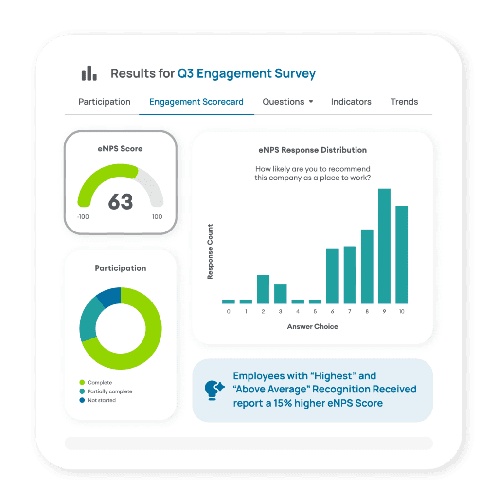 As the name suggests, the baseline survey’s results serve as a reference point that reflects the current state of engagement within your organization. These insights reveal where your culture is strong and which gaps need addressing, as well as where you should drill down further.