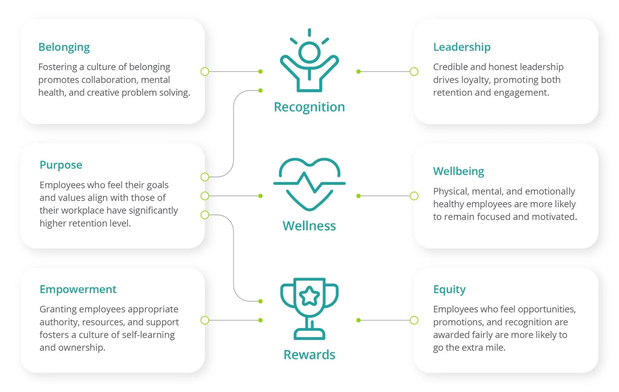 To understand what organizations can actually control, Terryberry's culture model identifies six factors that consistently shape how remote employees experience their work: